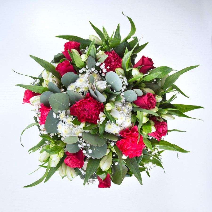 Embrace chic sophistication with our Red & White Luxe Bouquet. This elegant arrangement features immaculate white chrysanthemums and gypsophila paired with bold red roses and carnations. Accentuated by white alstroemeria and aspidistra leaves, each flower is meticulously arranged to deliver a bouquet that is both luxurious and unique.